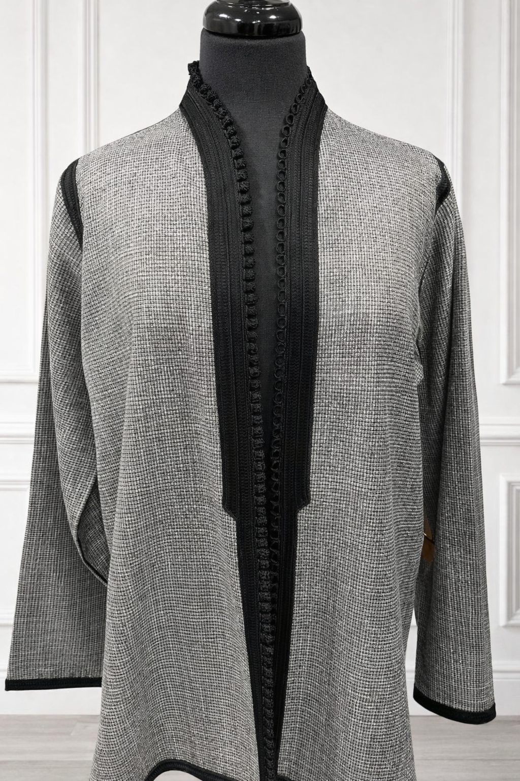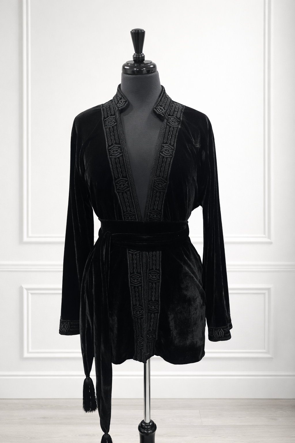 Kimono velours noir court - motif sur col ton sur ton + ceinture choucha