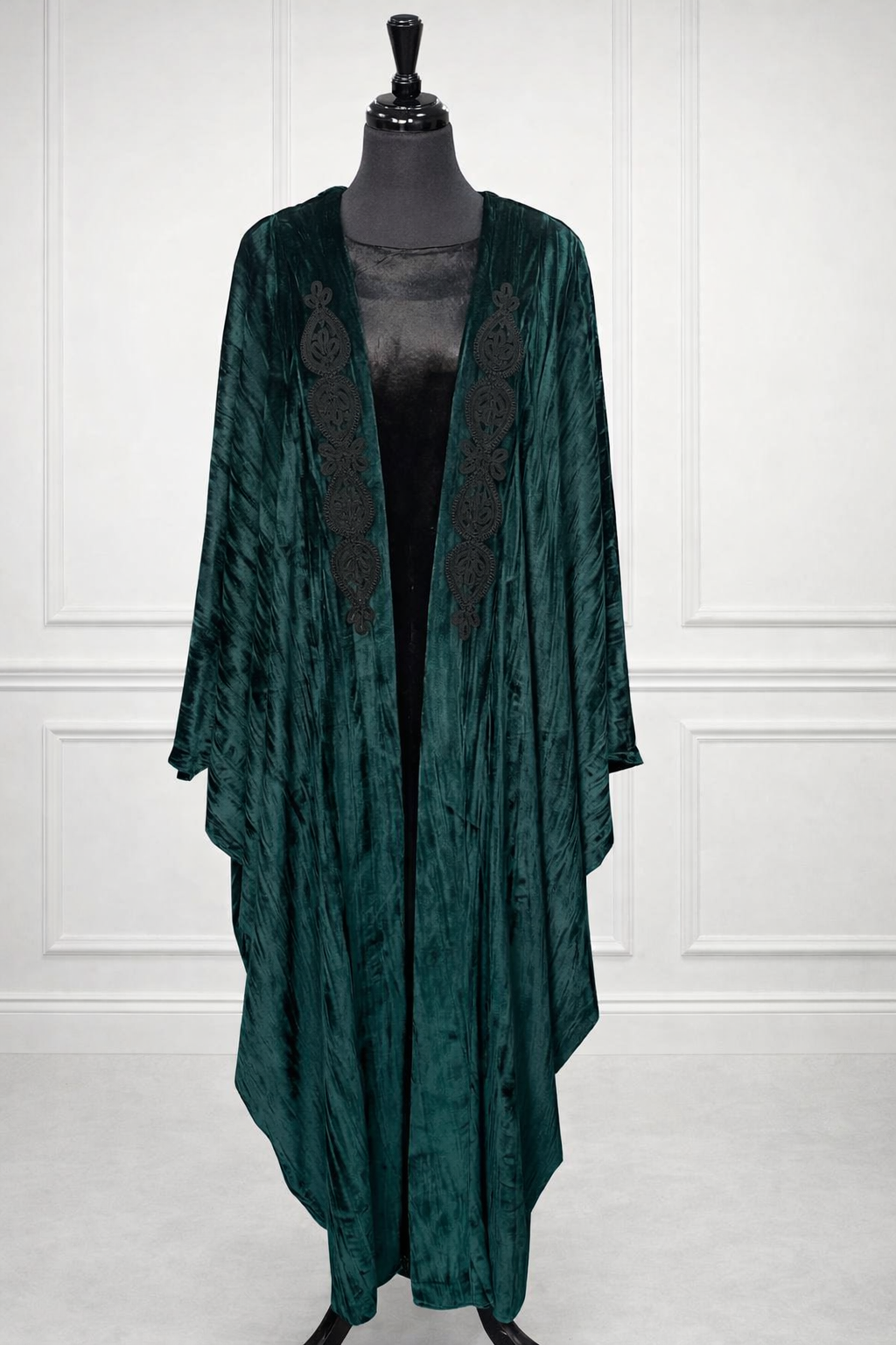 Kimono velours vert foncé coupe papillon + robe longue noire