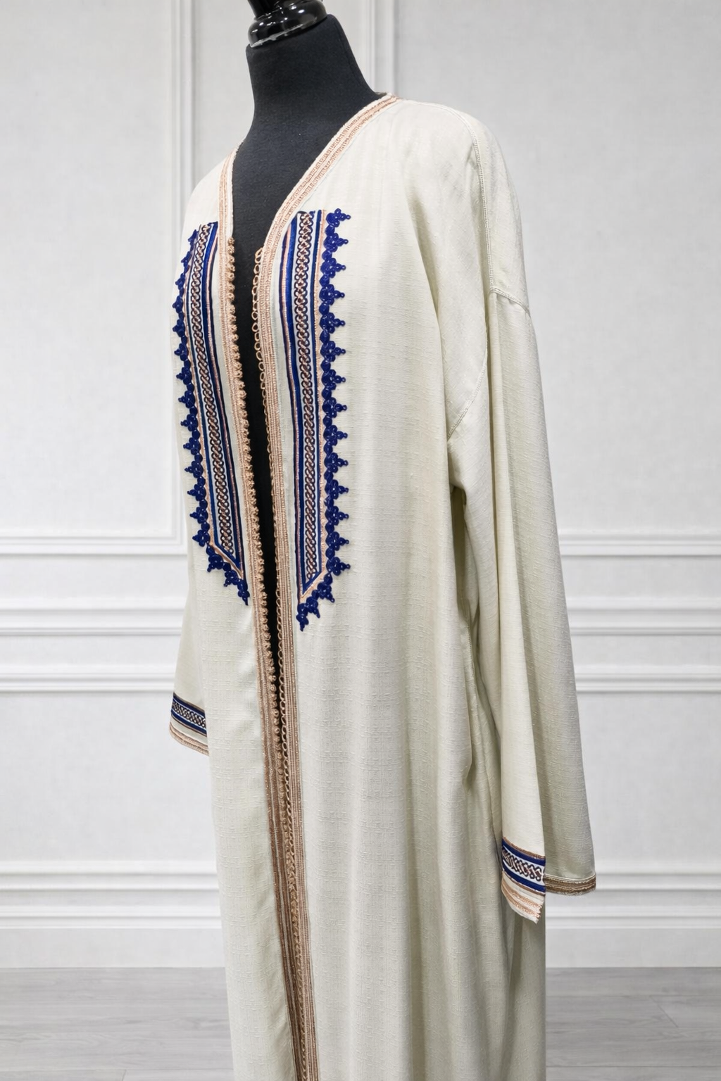 Kimono long en lin blanc cassé - design bleu sur face