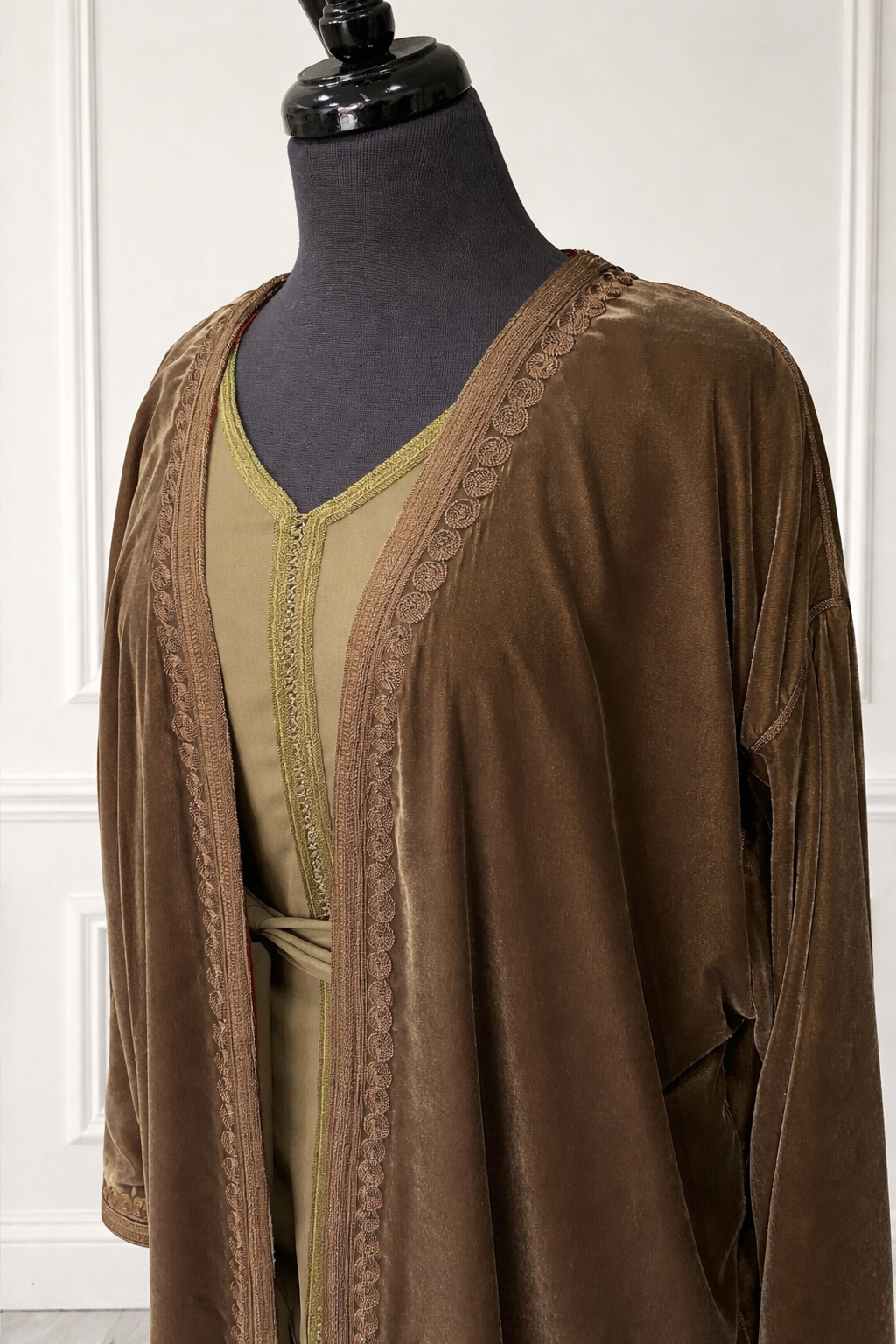Kimono velours beige kaki doux - interieur orange + ensemble + mejdoul