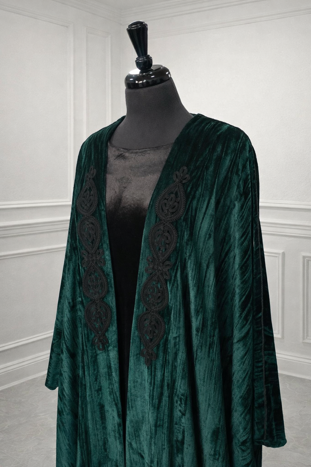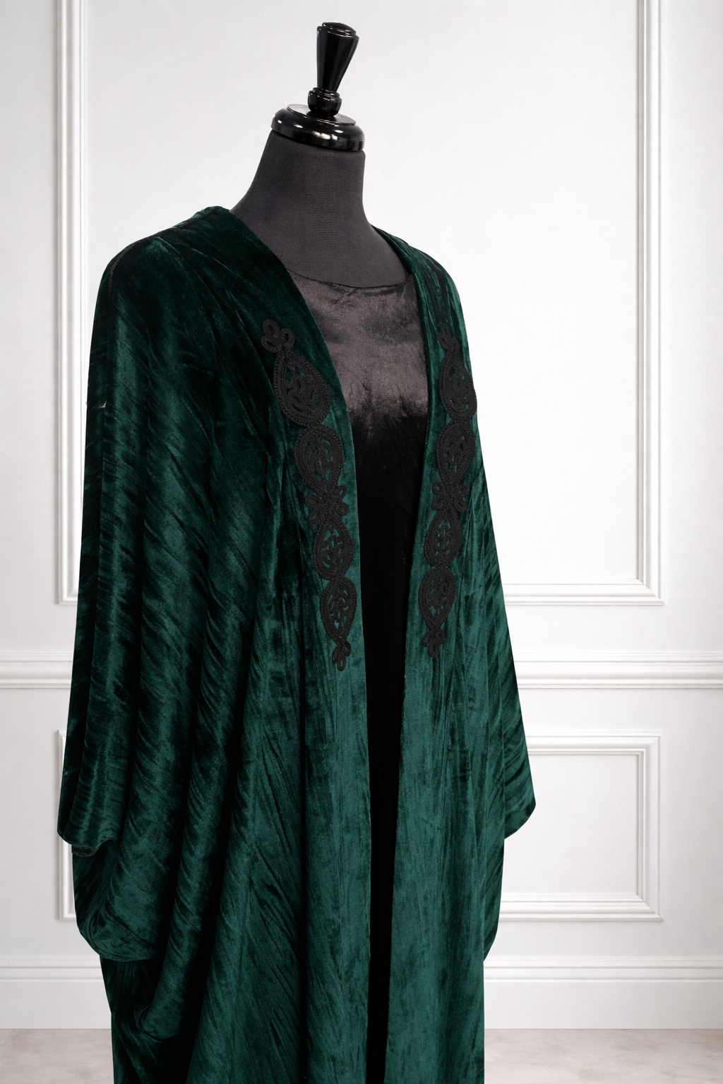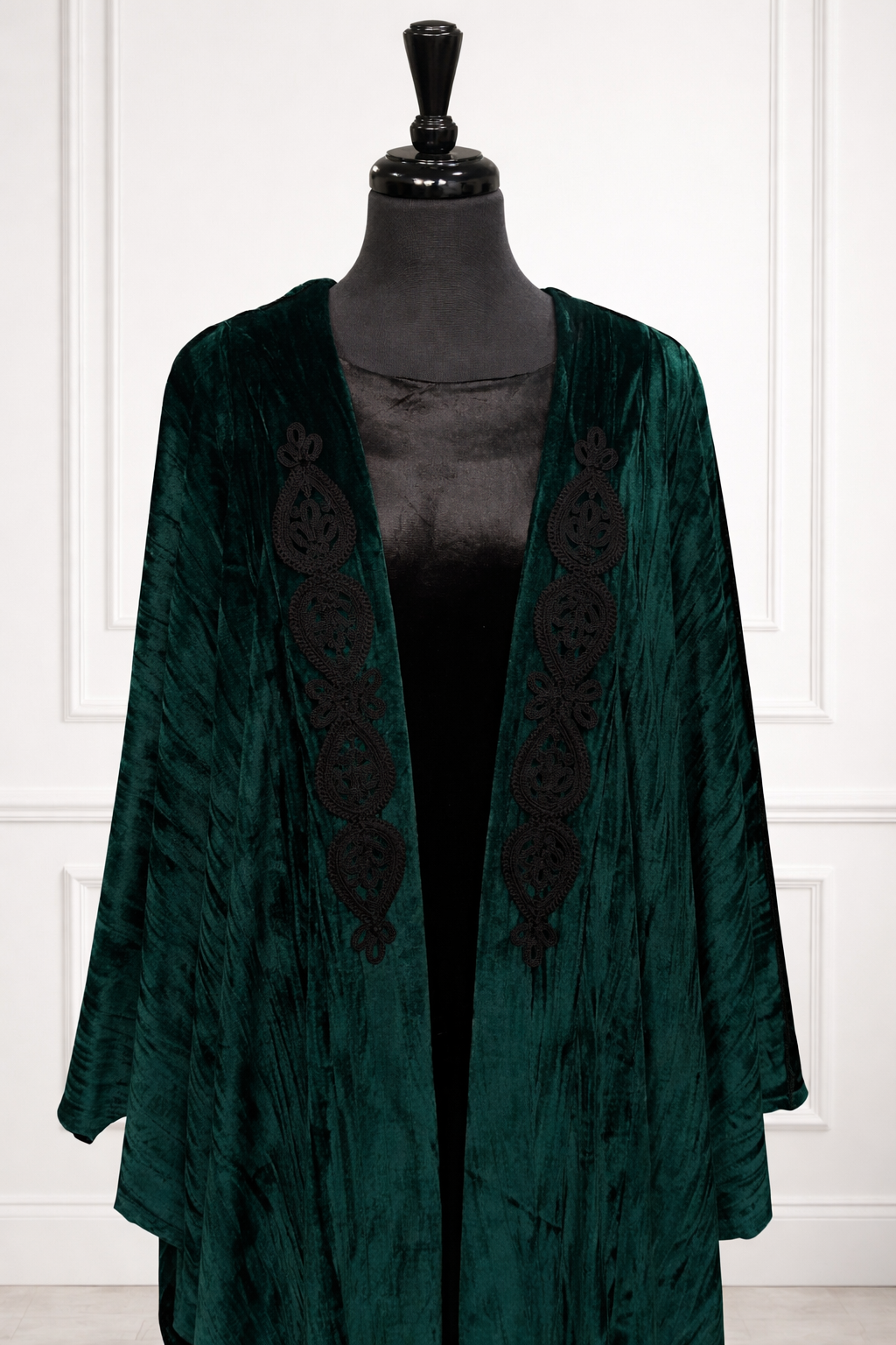 Kimono velours vert foncé coupe papillon + robe longue noire