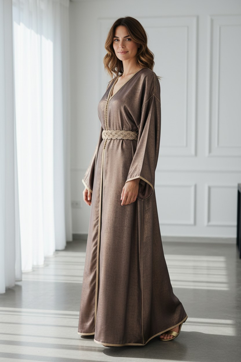 Caftan 2 pièces en lamé bronze cuivré + ceinture