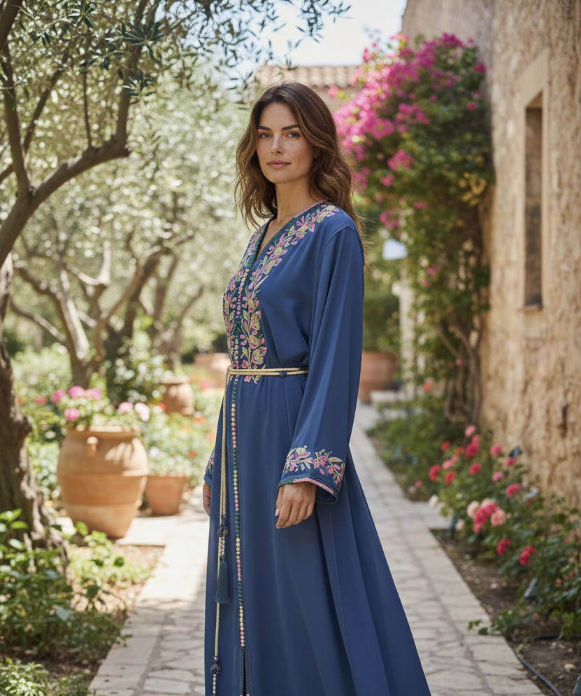 Caftan 1 pièce bleu fleuri rose/doré + ceinture dorée