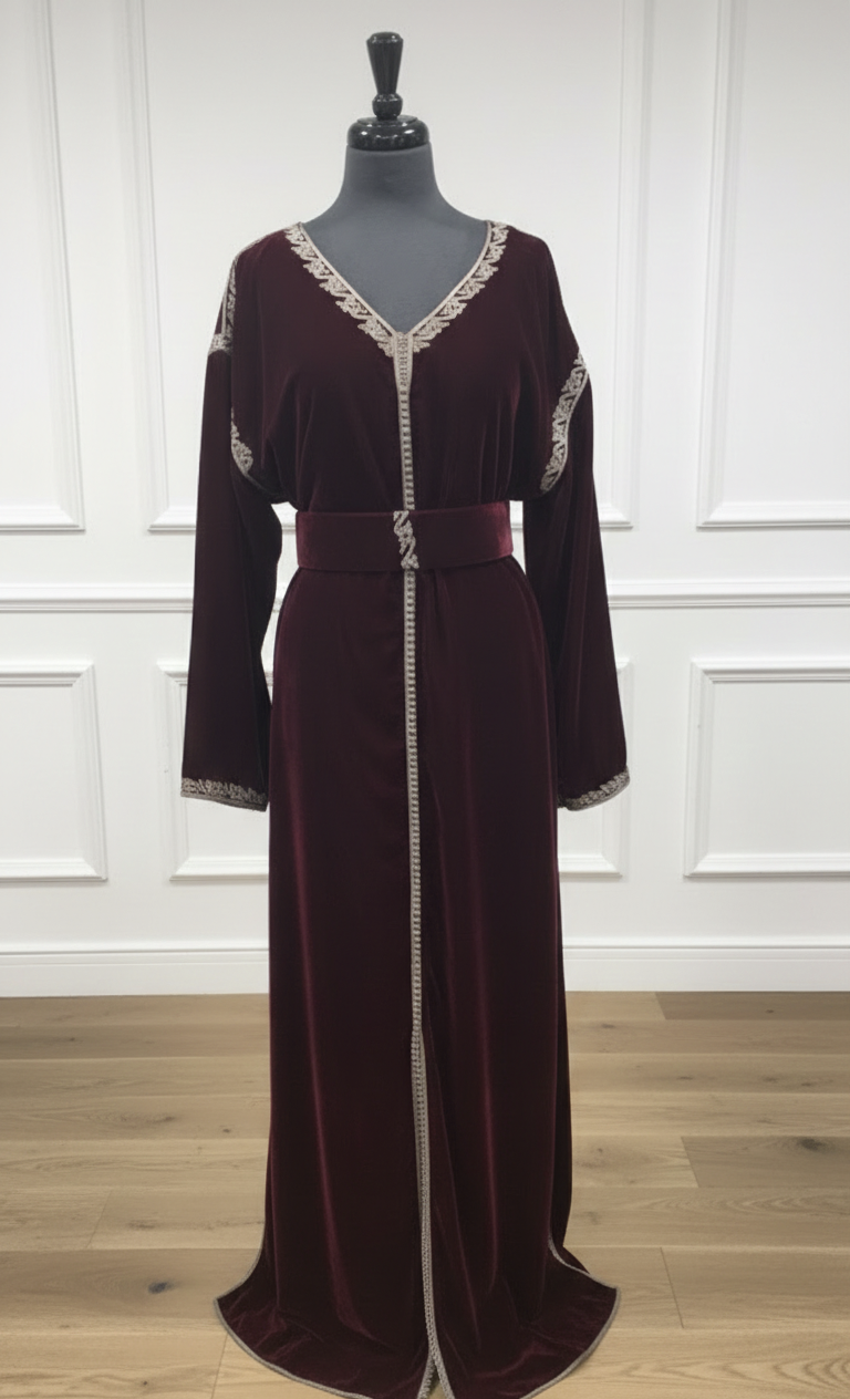 Caftan 1 pièce velours bordeau - intérieur satin gris + ceinture