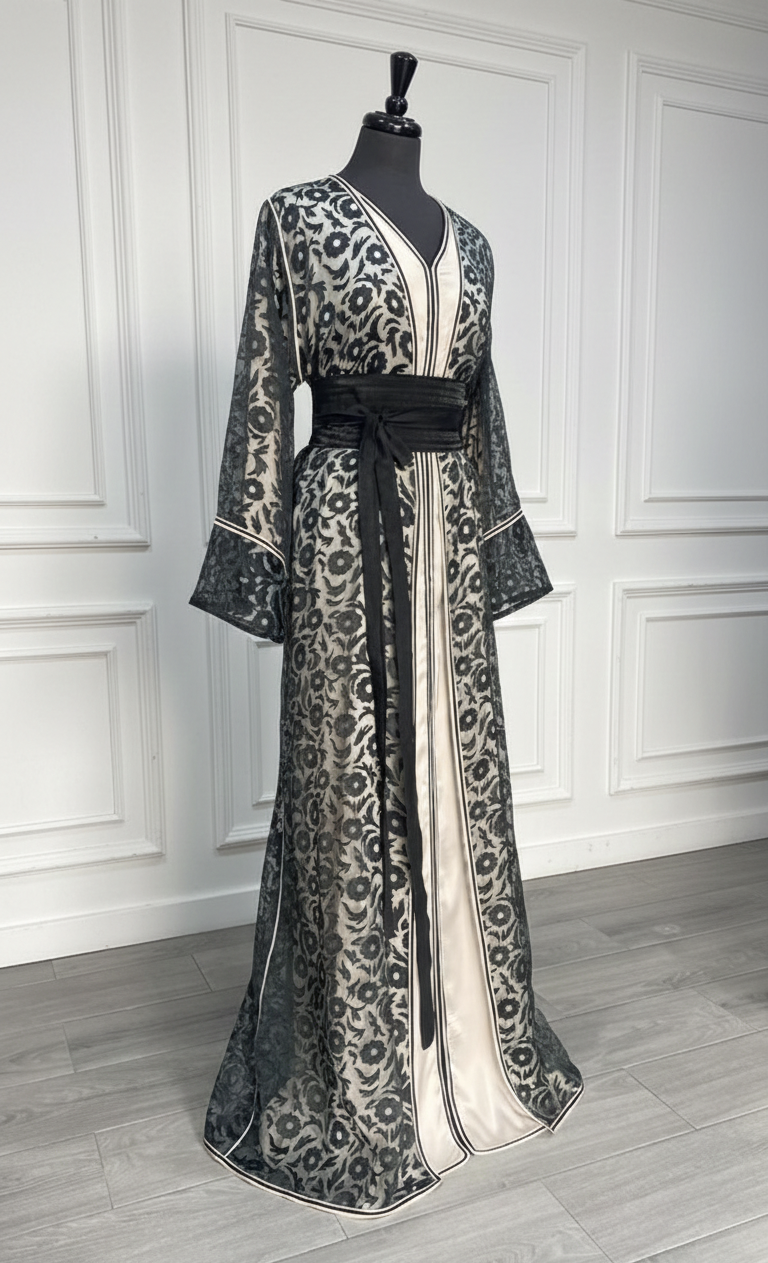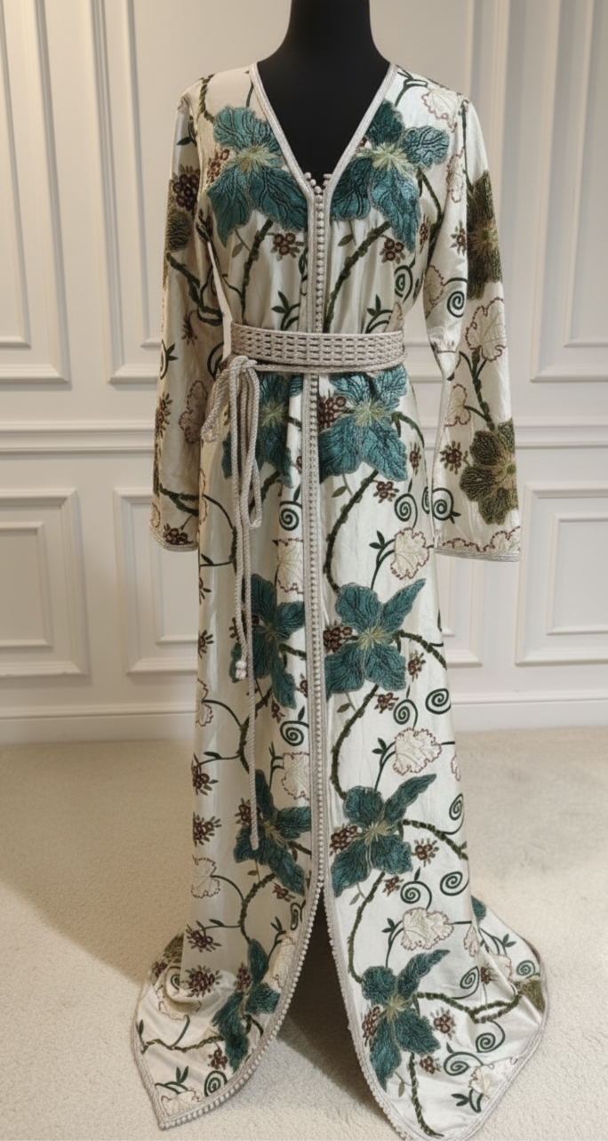 Caftan 1 pièce - brocard fleuri fait mains + ceinture Hrir