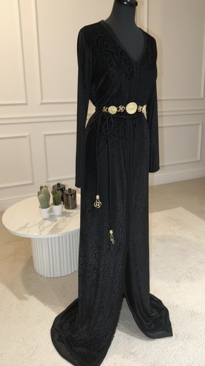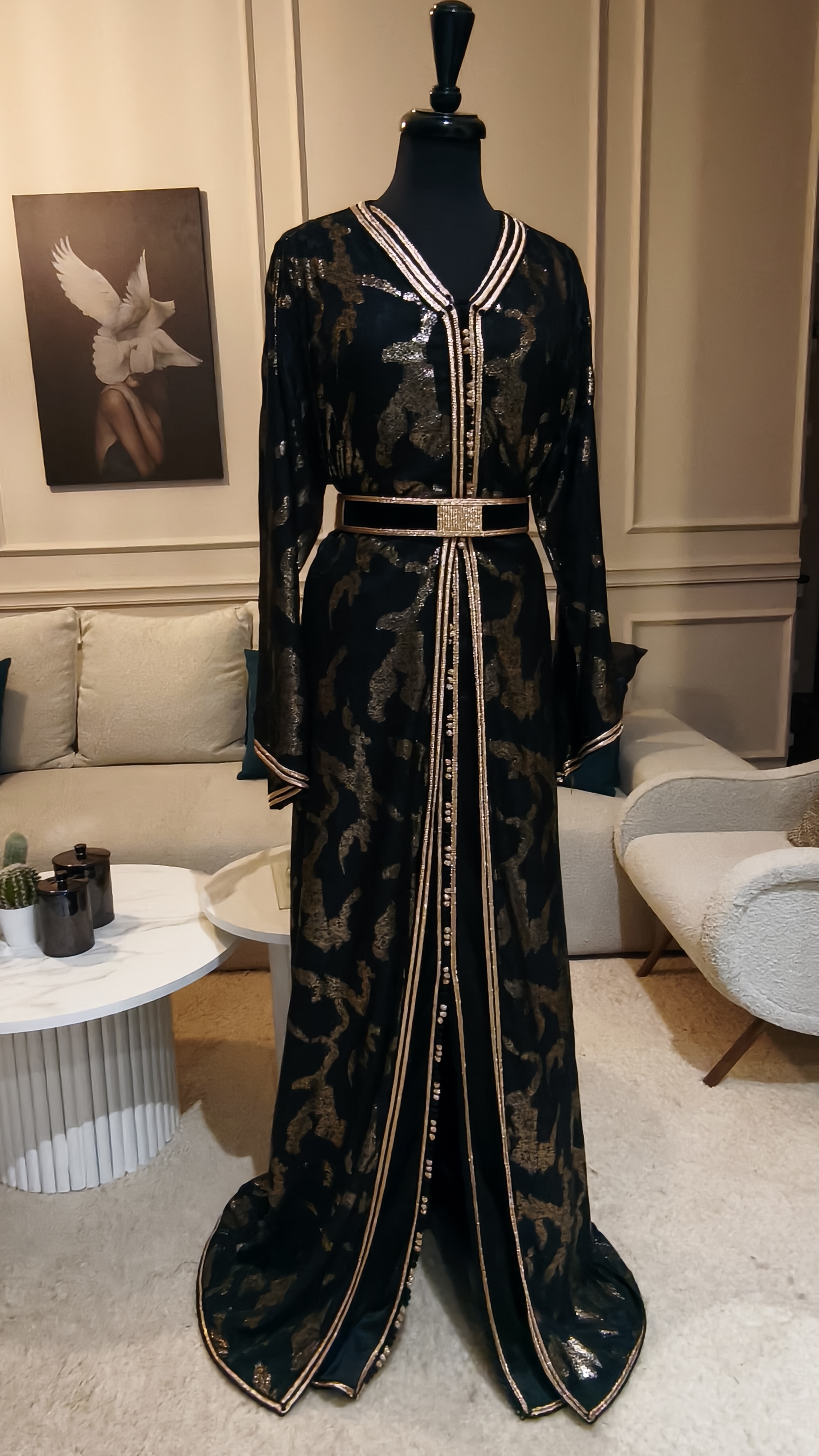 Caftan 2 pièces noir/ cuivre + ceinture en velours et sqalli