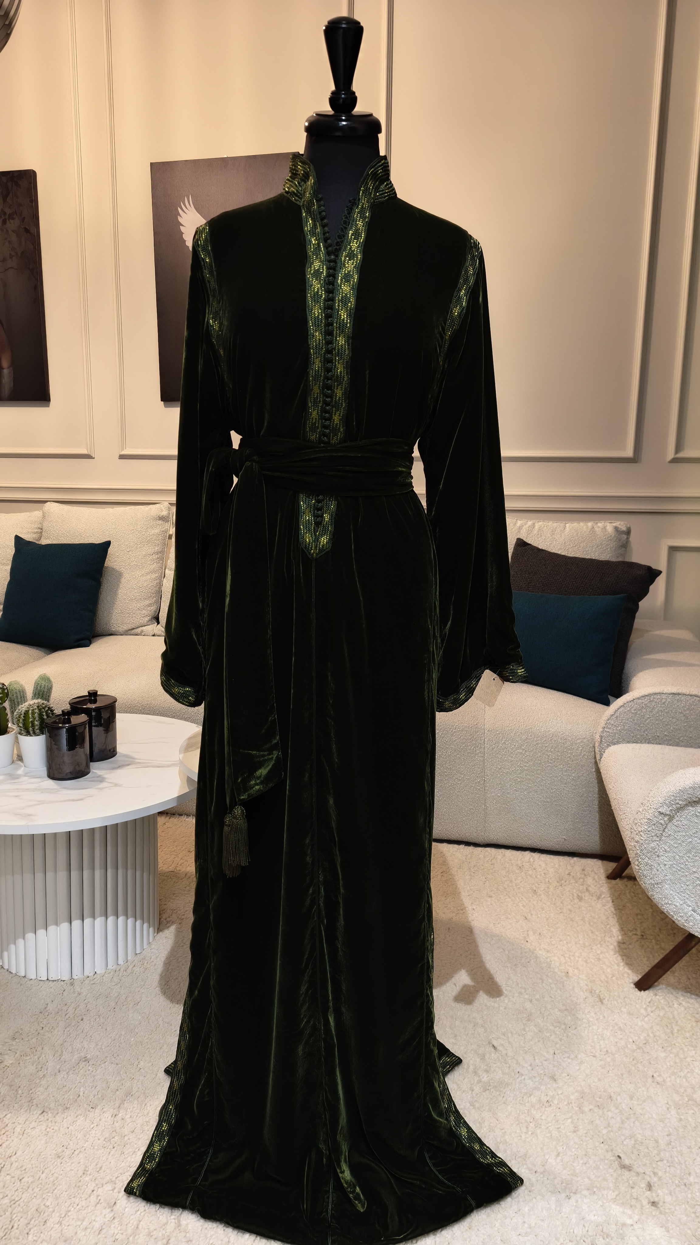 Caftan en satin et lamé vert bouteille + ceinture ajustable