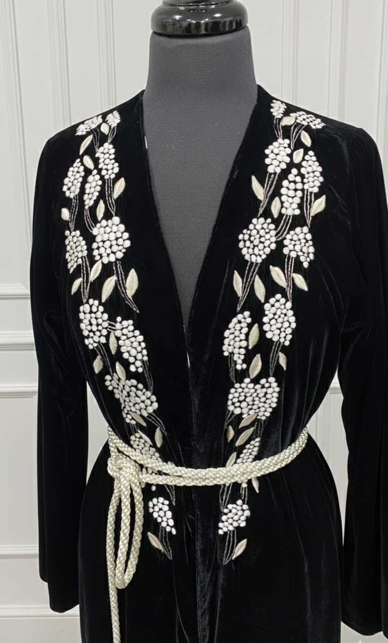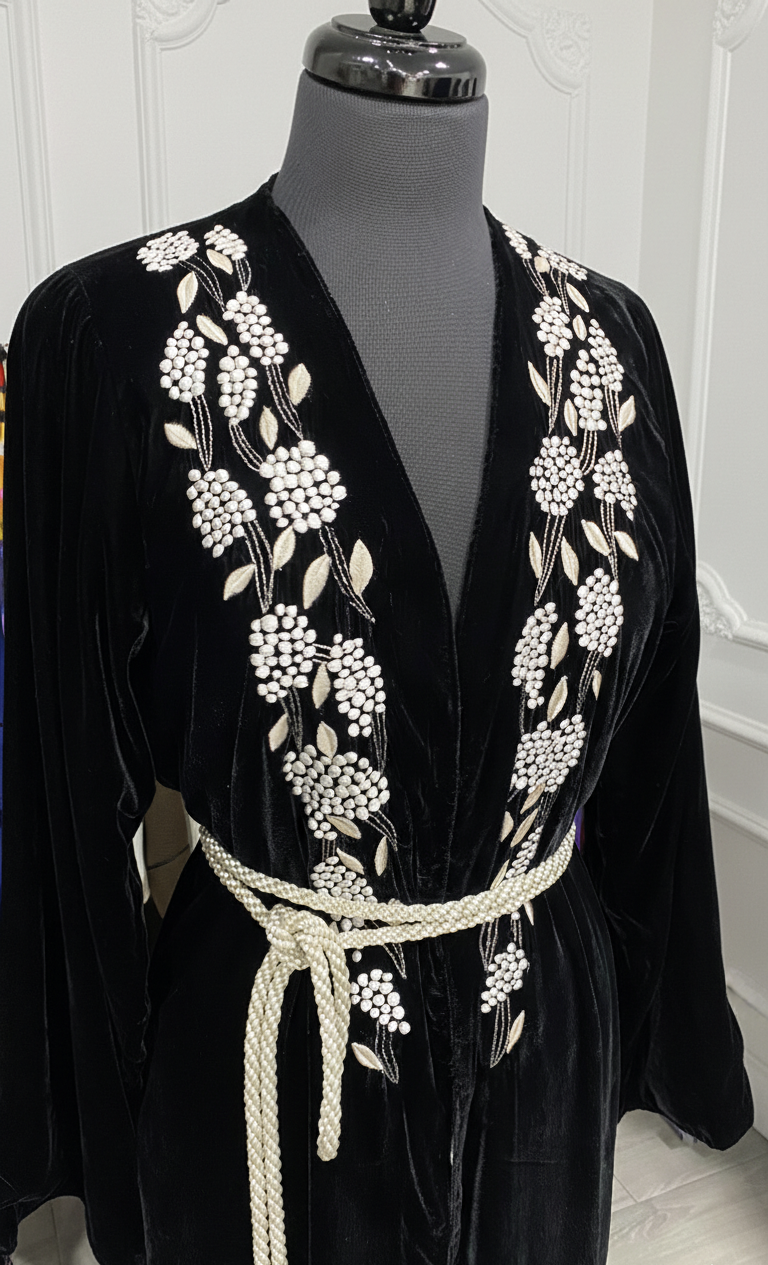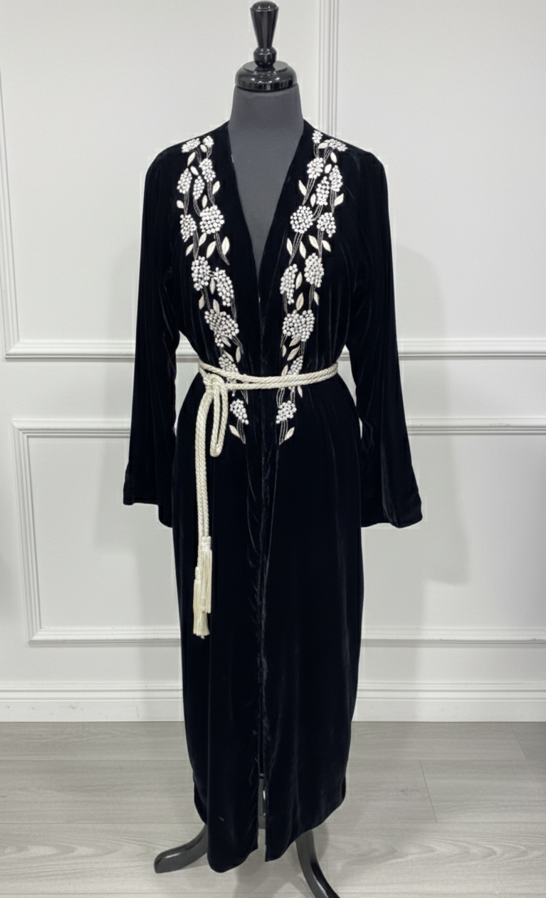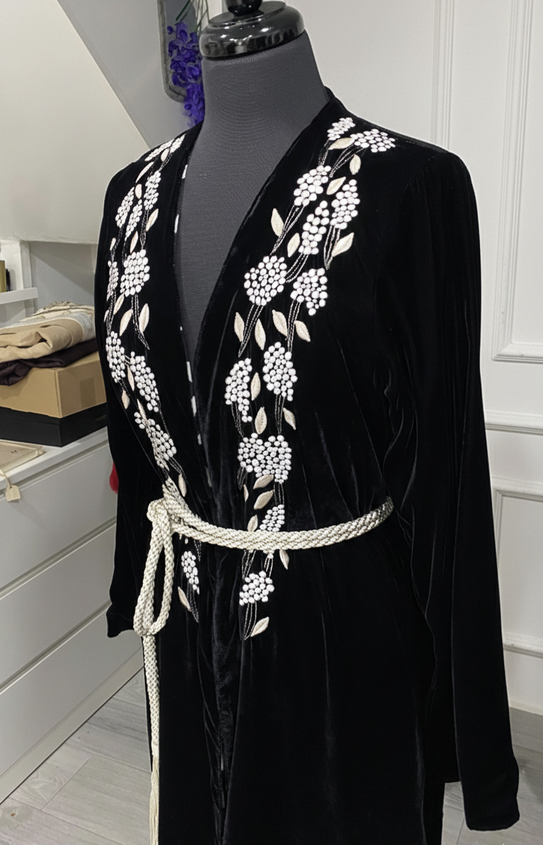 Kimono velours noir long broderie fleurs blanches + mejdoul