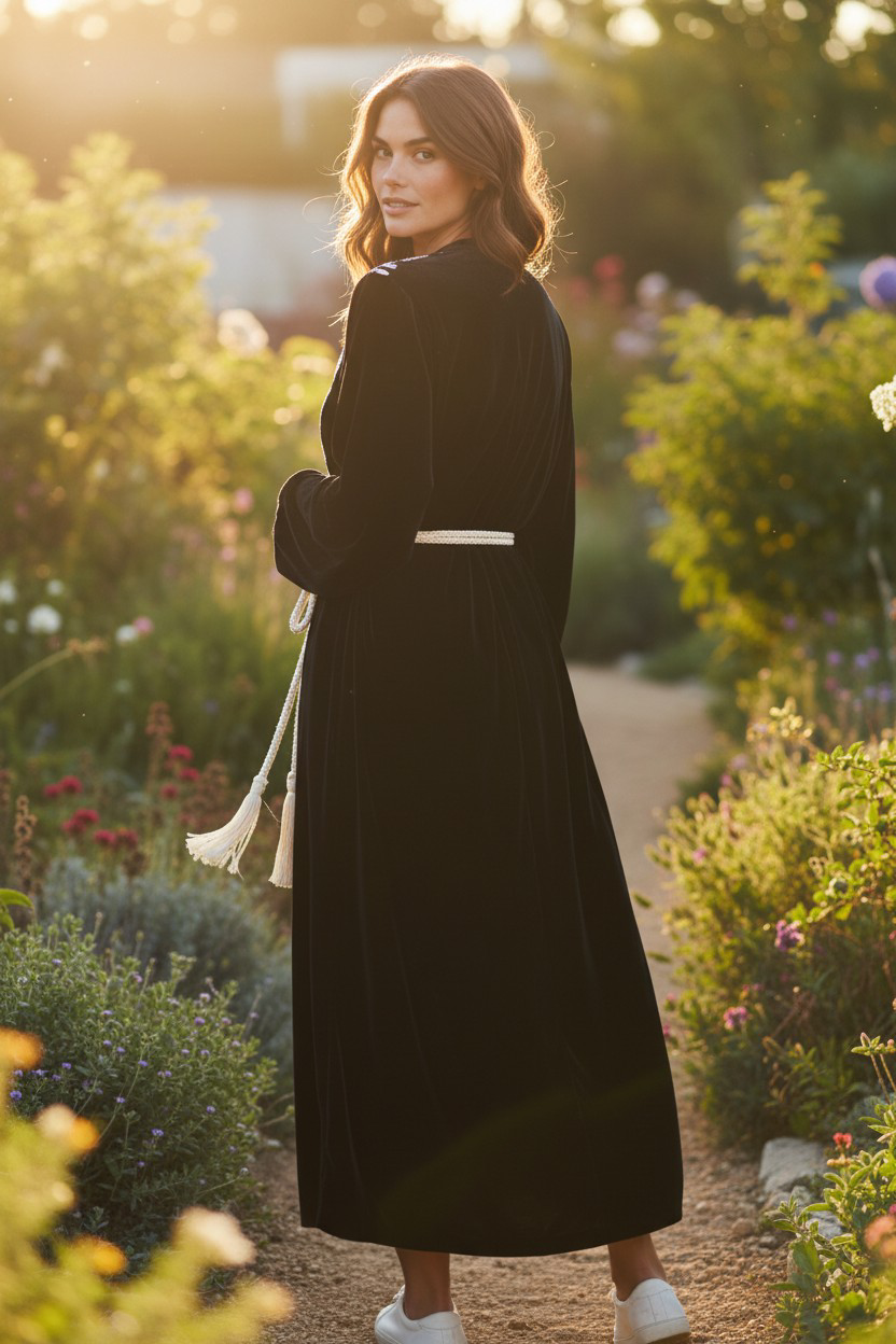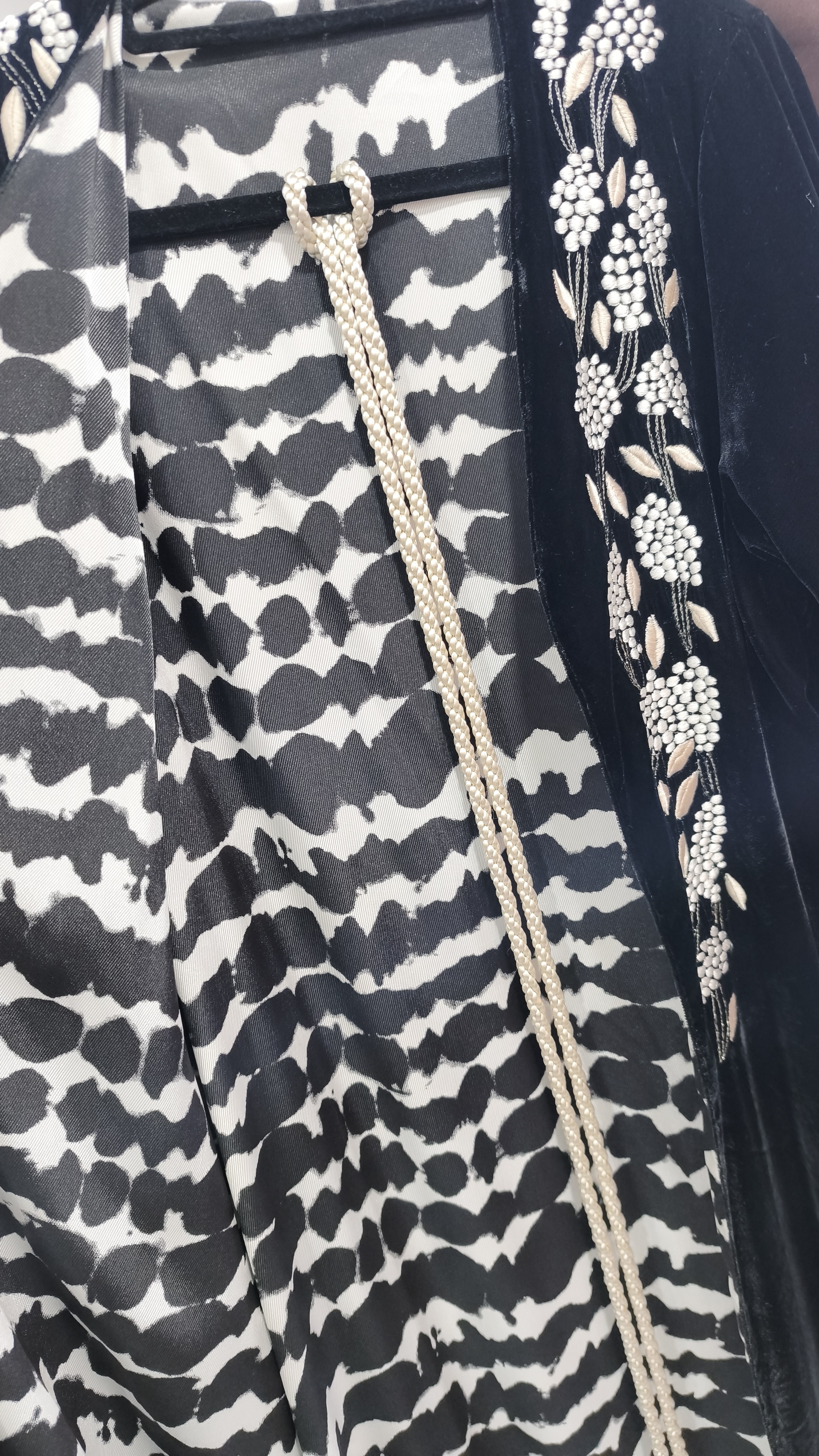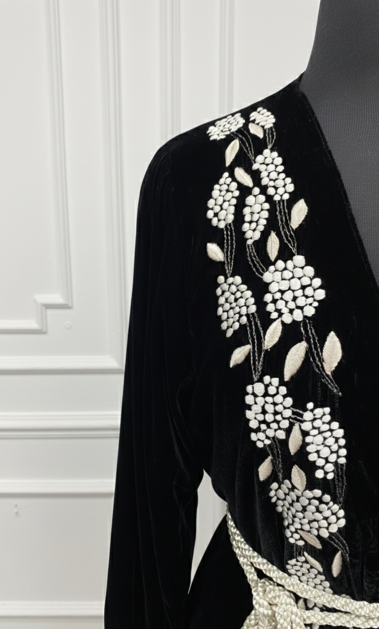Kimono velours noir long broderie fleurs blanches + mejdoul