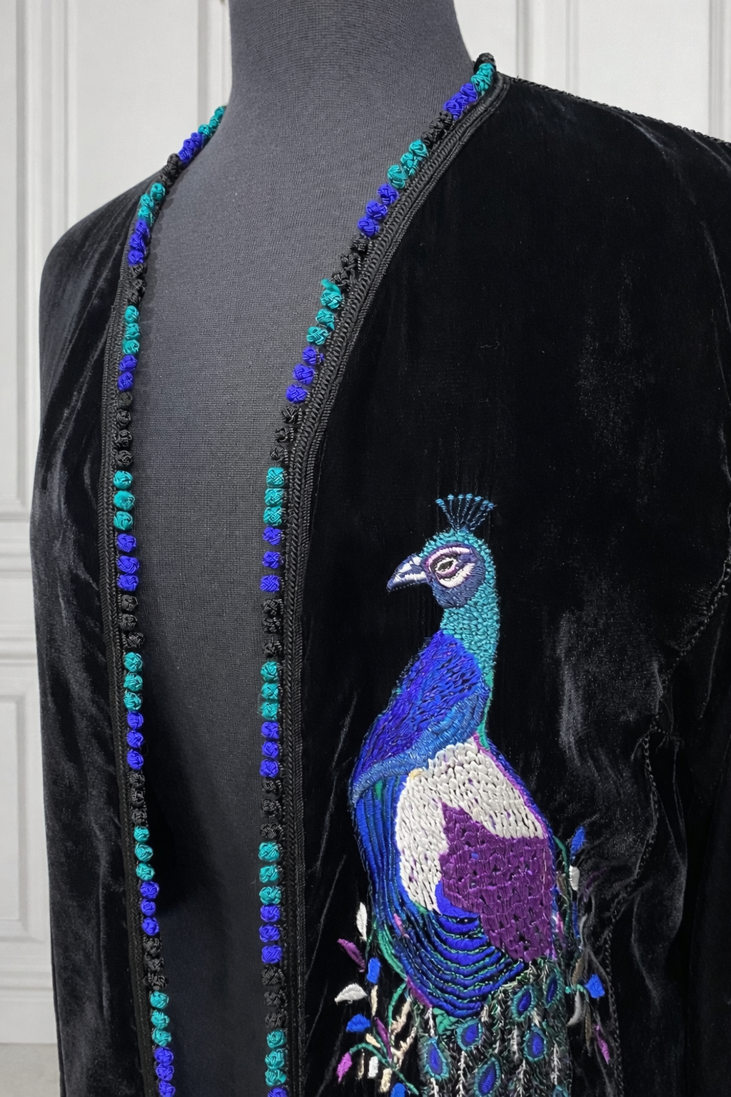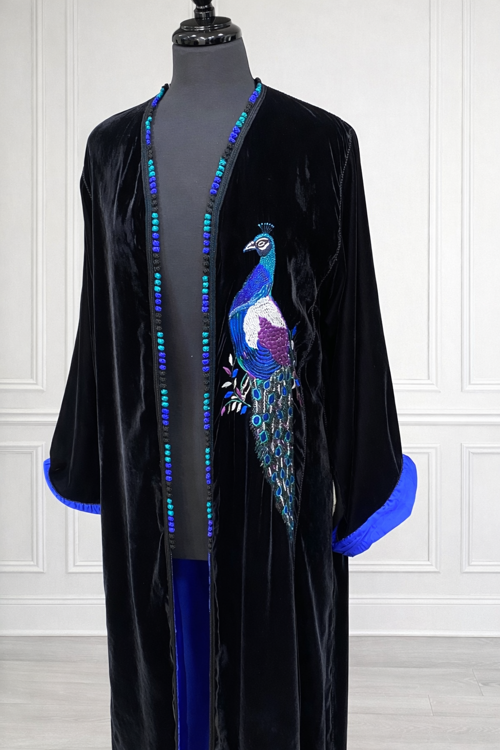 Kimono velours noir - intérieur satin bleu électrique- brodé paon avec 39ad couleurs