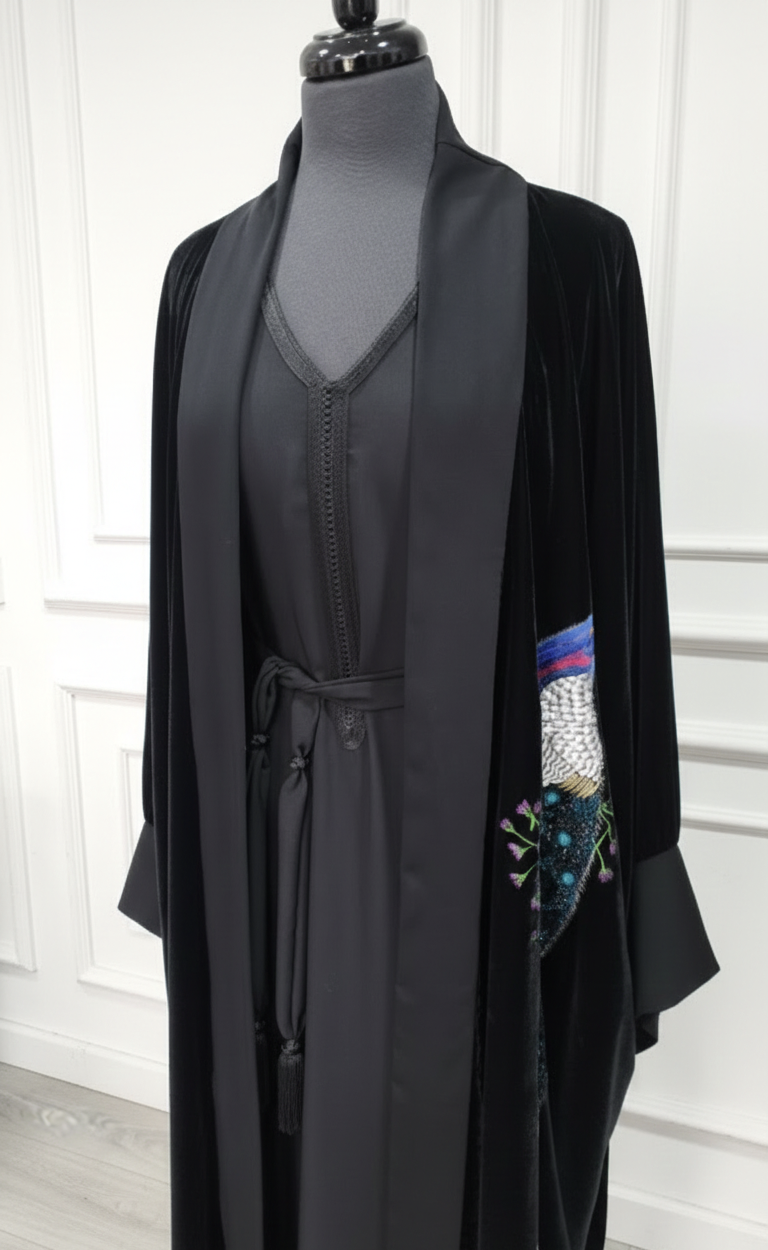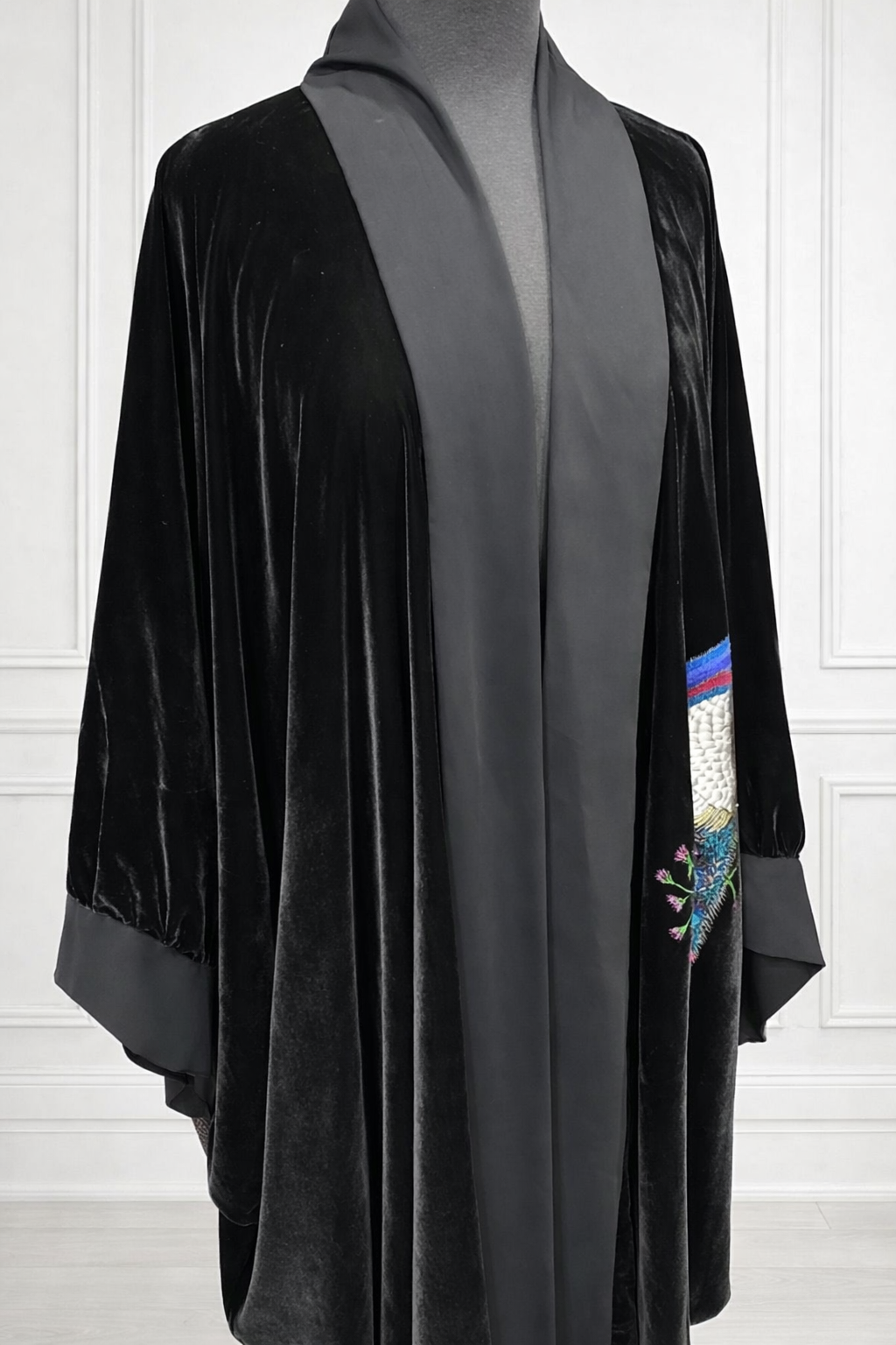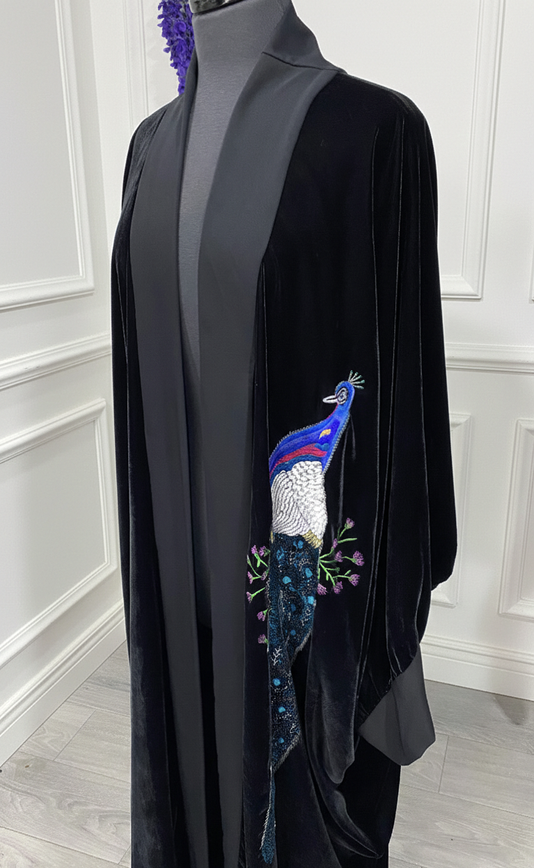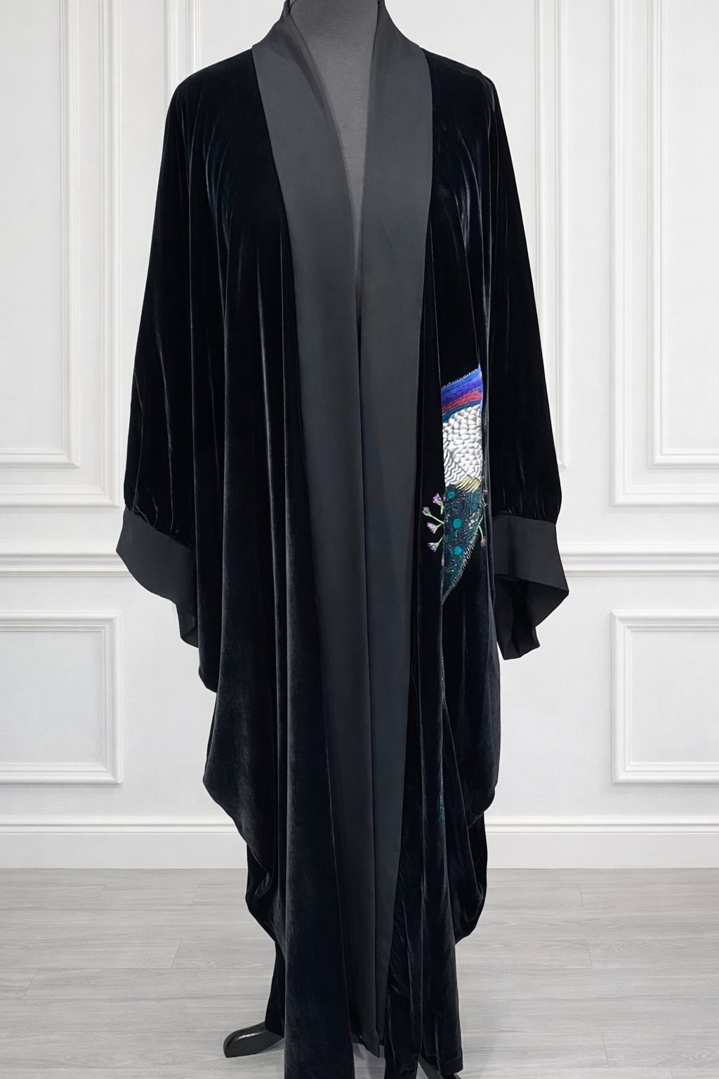 Kimono velours noir - coupe papillon - brodé paon bleu/ blanc