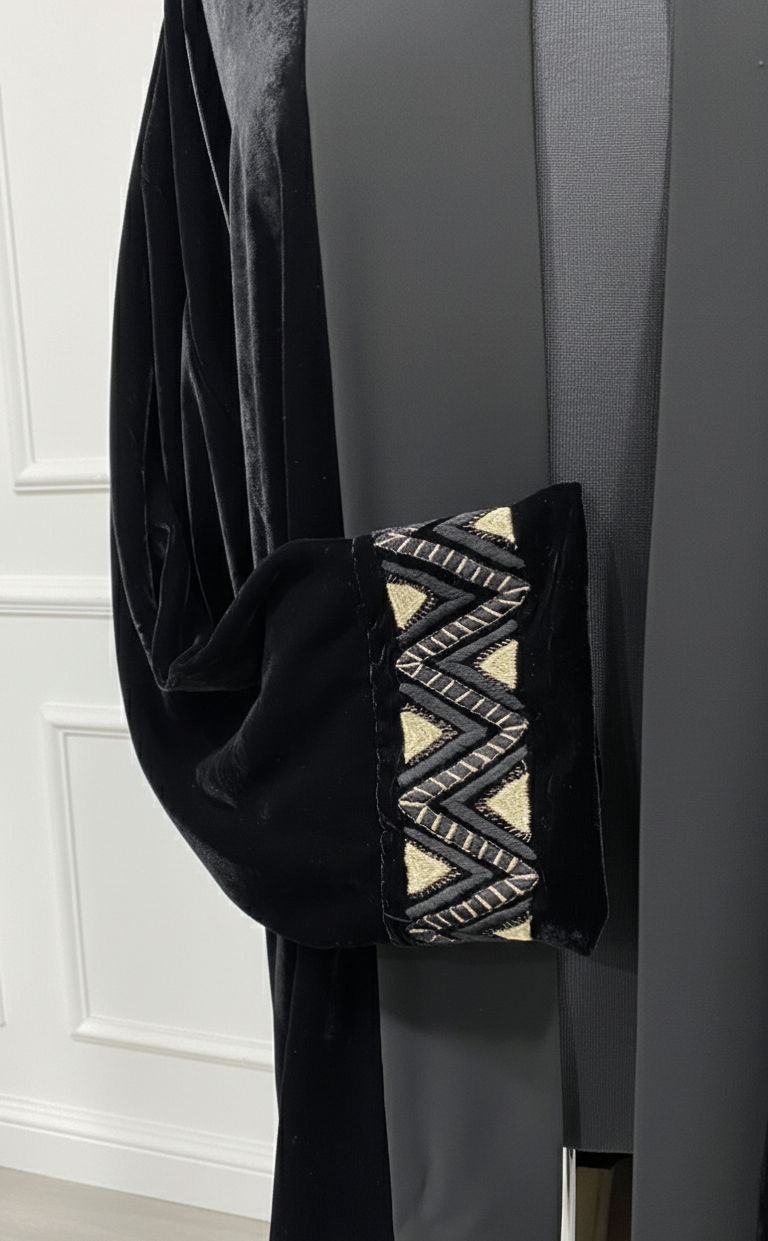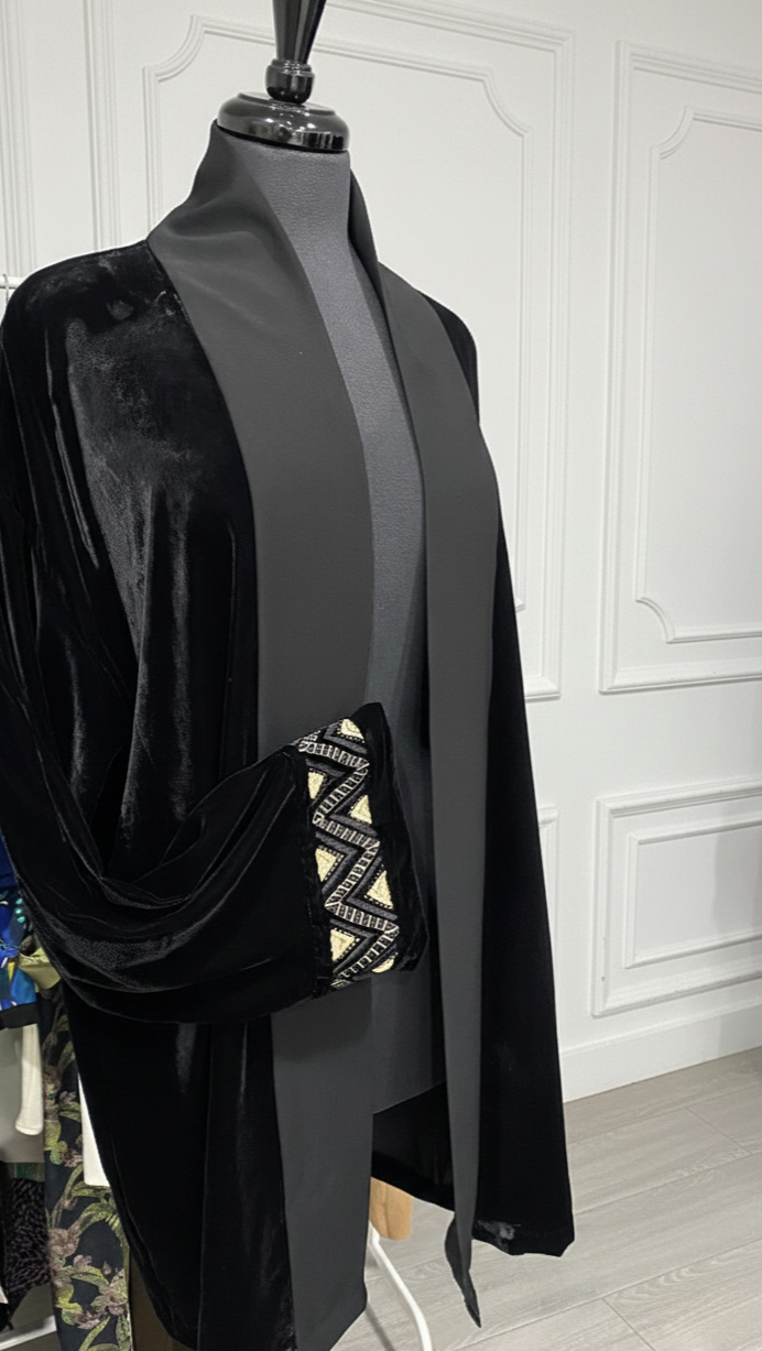 Kimono velours noir mi-long- motifs beiges sur manches