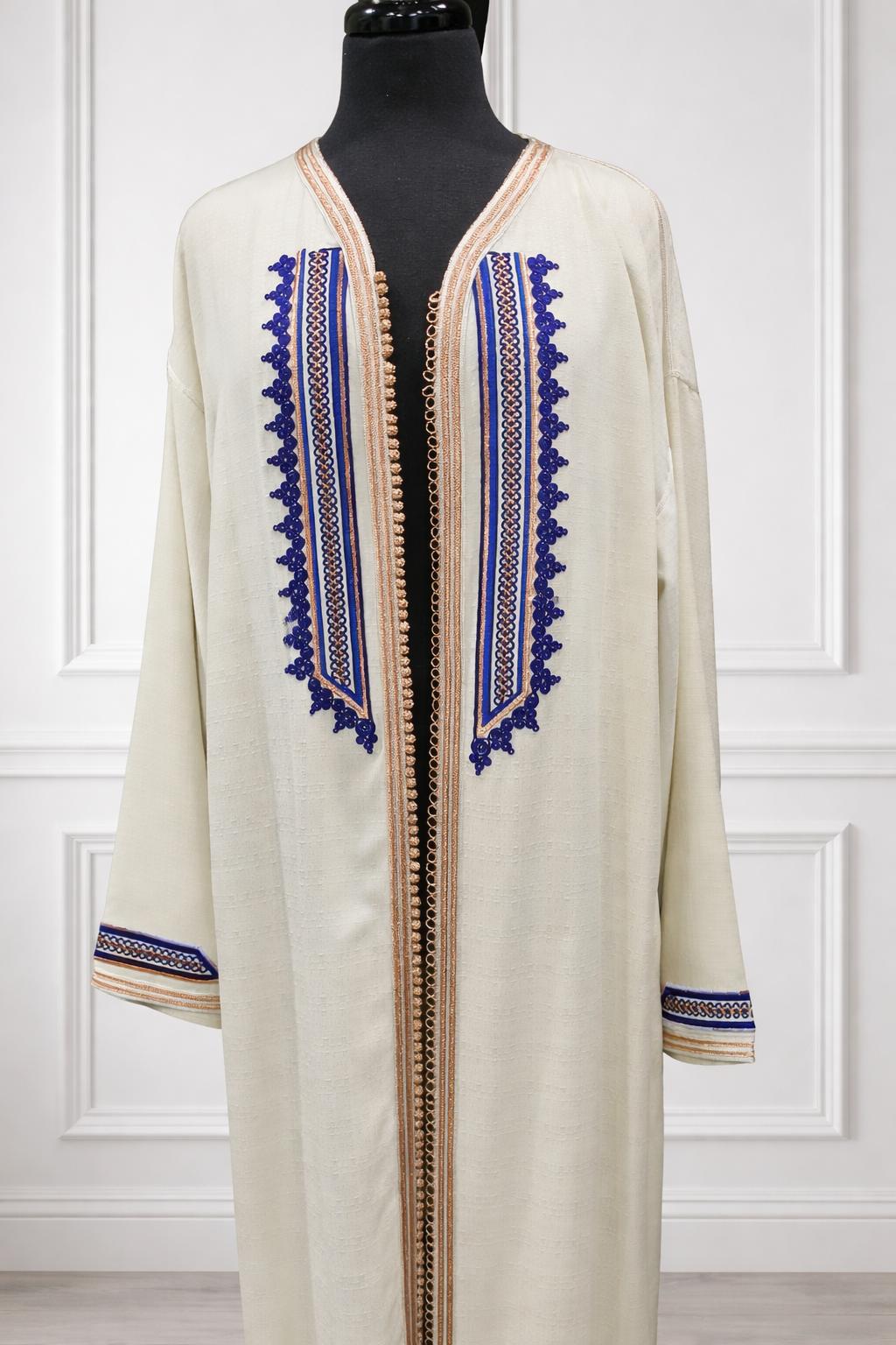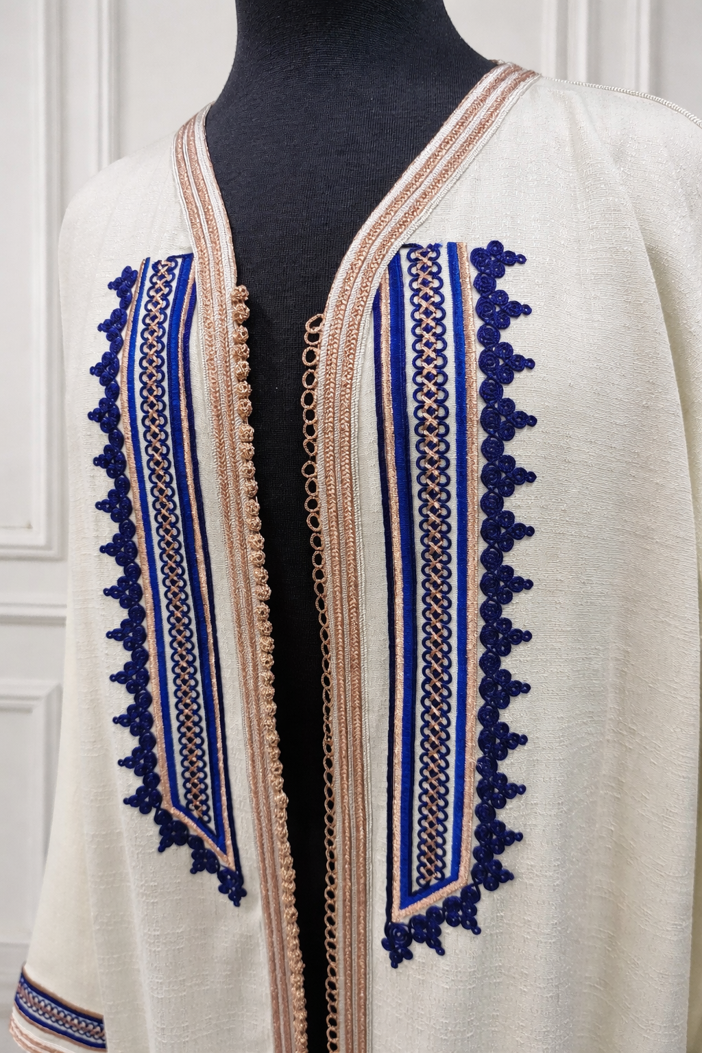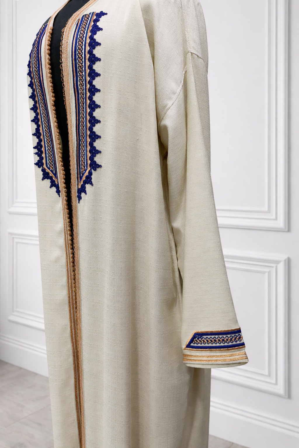 Kimono long en lin blanc cassé - design bleu sur face