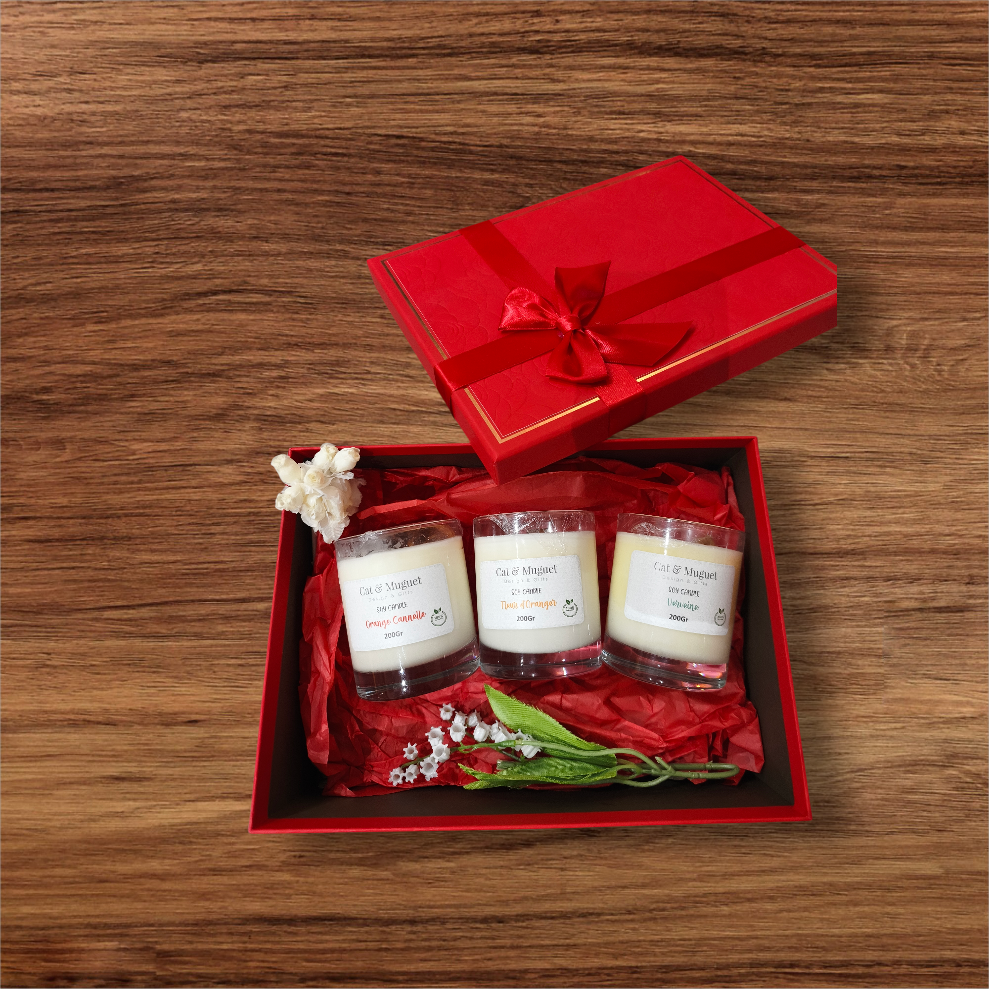 Un écrin de passion rouge (28x21x8,5) renfermant une trilogie de bougies artisanales, faites à base de cire de soja, a été conçu pour transformer votre intérieur en un havre de raffinement.