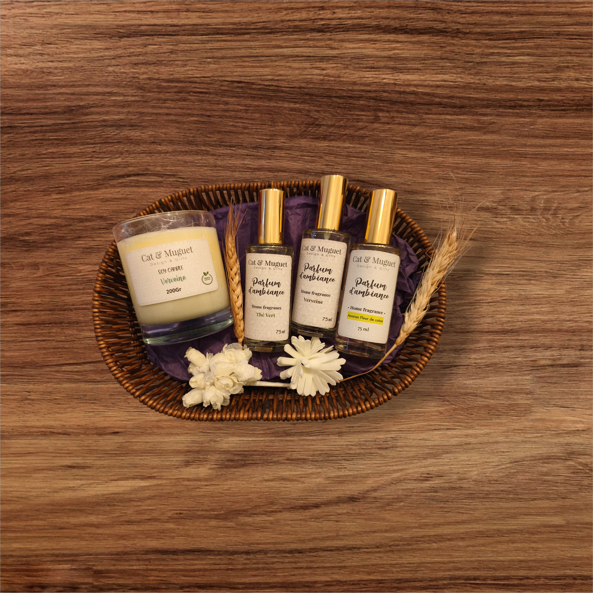 Le panier Rituel Parfumé: 1 bougie 200g +3 parfums d'ambiance 75ml
