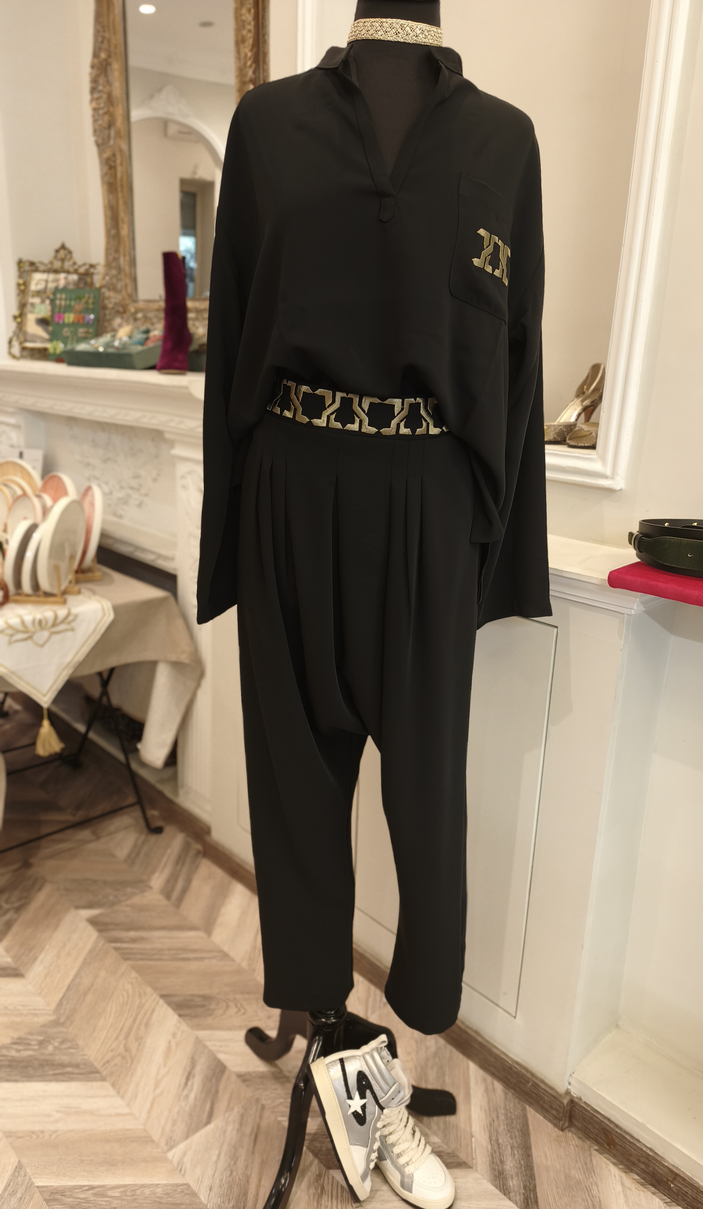 Ensemble: pantalon Kandrissa + chemisier manches longues noirs brodés en bronze